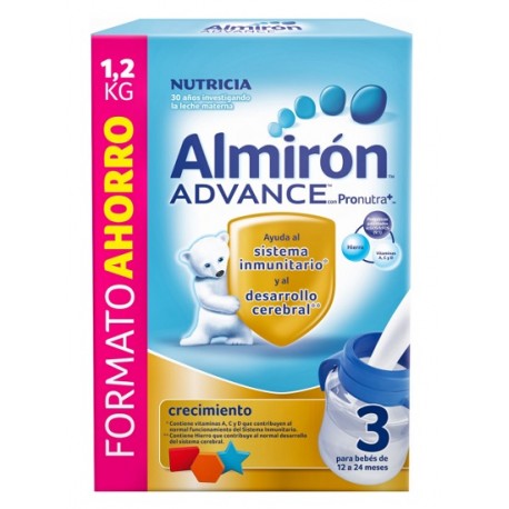 Crecimiento – Contiene vitaminas A, C y D que contribuyen al normal funcionamiento del Sistema Inmunitario. – Contiene Hierro que contribuye al normal desarrollo del sistema cerebral. Indicaciones Los expertos en nutrición infantil recomiendan, siempre que sea posible, la leche materna como mejor alimentación para el bebé. Almirón Advance 3 es la fórmula de crecimiento indicada desde los 12 a los 24 meses para esta tercera etapa de desarrollo, en la que se recomienda un consumo diario de 500ml de leche adaptada