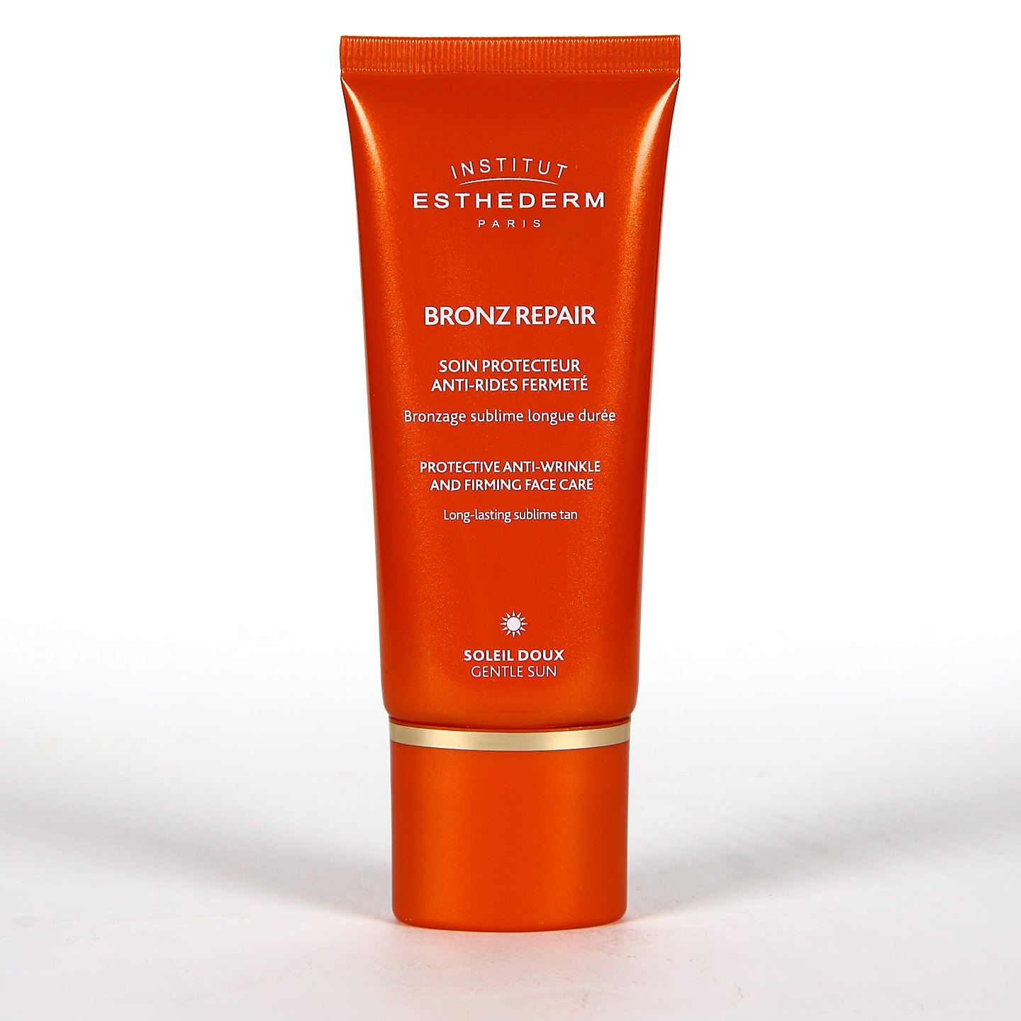 Esthederm Bronz Repair Crema Facial Protectora Antiarrugas Sol Suave es un protector facial con acción antiedad y efecto reafirmante, que además de proteger la piel de la radiación solar (índice UV 1-3), reduce la arrugas y líneas de expresión del rostro. Su composición, basada en cuatro tecnologías exclusivas de Esthederm, adapta la piel a la exposición solar, intensificando y optimizando el bronceado natural, al tiempo que estimula las defensas naturales frente a los efectos nocivos del sol, mientras que la patente Repair por su parte, favorece el efecto tensor de la piel.