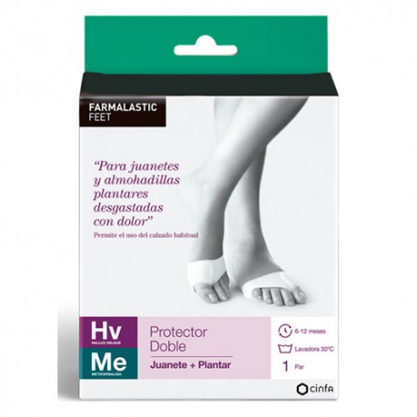 Evitar y aliviar las metatarsalgias / dolores plantares del antepié debidos a envejecimiento o desgaste de la almohadilla plantar natural del pie, durezas, recalentamiento, prolongada postura de pie, etc. Evitar y aliviar los dolores provocados por fricción excesiva sobre el juanete (hallux valgus). No utilizar sobre heridas abiertas. Silicona 81%, poliamida 19%.