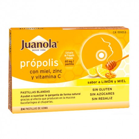 Juanola própolis + hedera con miel, zinc y vitamina C son unas pastillas blandas que combinan el efecto del extracto de própolis (60 mg/pastilla), la miel (10 mg/pastilla), el zinc (0,8 mg/pastilla) y la vitamina C (6 mg/pastilla), para suavizar la garganta gracias al efecto que producen las pastillas en la mucosa bucofaríngea al chuparlas.SIN AZÚCARESSIN CONSERVANTESSIN GLUTENSIN REGALIZCON EDULCORANTES