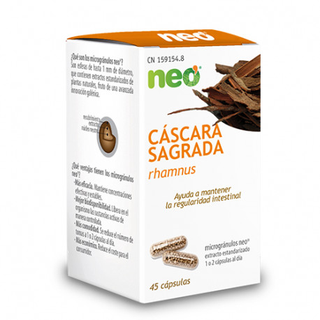 Neo Cáscara Sagrada 45 cápsulas ha sido elaborado con cáscara sagrada, utilizada como laxante de corta duración, en los casos de estreñimiento ocasional. Su acción radica en la capacidad de estas sustancias a la hora de modificar su estructura en el intestino grueso a través de la rotura de las moléculas y a la acción que ejerce la flora intestinal de la zona. Esta acción metabólica favorece un aumento del movimiento peristáltico, propio de las tripas, y a una mayor secreción de agua y electrolitos de la mucosa hacia el exterior, favoreciendo la evacuación.