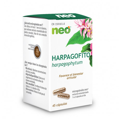 Neo Harpagofito 45 cápsulas ha sido elaborado con harpagofito, la cual es una planta herbácea de la familia de las pedaliáceas. La parte activa de esta planta son las raíces secundarias, que contienen una alta proporción de iridoides. Entre estos, destaca principalmente el harpagósido, junto a pequeñas cantidades de cumaroil-harpágido, procúmbido y cumaroil-éster. También contiene azúcares, fitosteroles, flavonoides, ácidos fenólicos y trazas de aceite esencial. Actúa, así mismo, como antiinflamatorio, especialmente en inflamaciones agudas y crónicas.