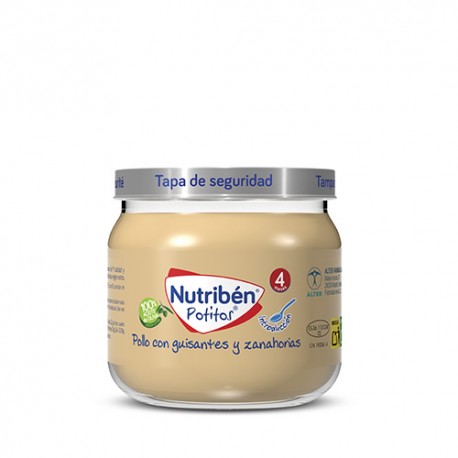 Nutribén Potitos Pollo con Guisantes y Zanahorias está elaborado para la alimentación completa y variada de tu bebé. Con aceite de oliva 100%, sin gluten, sin huevo y sin leche, evitando así posibles alergias o intolerancias alimentarias. Tampoco contiene sal añadida, aromas, especias, colorantes, conservantes ni BPA.