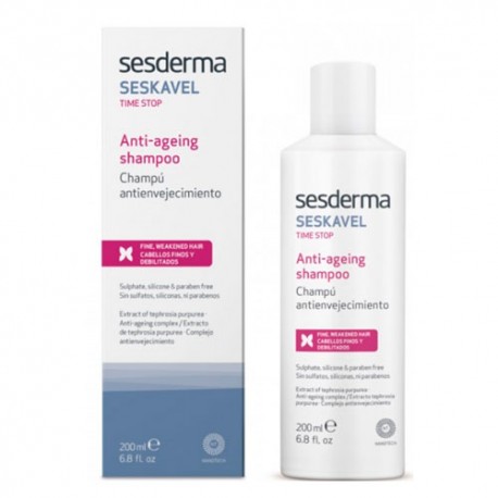 Sesderma Seskavel Time Stop Champú Antienvejecimiento 200 ml protege el cabello del paso del tiempo y de las agresiones externas. Contiene Cafeína, que bloquea el efecto de la enzima DHT evitando la caída del cabello y estimulando su crecimiento.