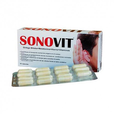 SONOVIT es un producto formulado con Ginkgo Biloba que favorece la circulación periférica que es especialmente importante para los oídos. Contribuye a una buena audición. También contiene Melatonina, Vitaminas y Hierro.
